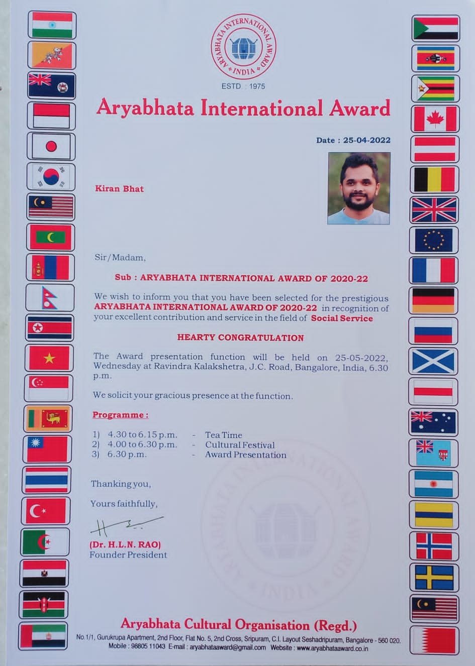 ಭೈರುಂಬೆಯ ಕಿರಣ ಭಟ್ಗೆ ಆರ್ಯಭಟ ಅಂತರಾಷ್ಟ್ರೀಯ ಪ್ರಶಸ್ತಿ