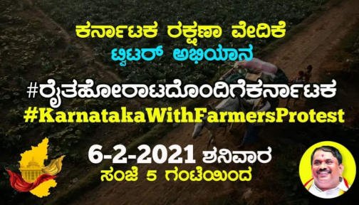 ಇಂದು (ಶನಿವಾರ) ಸಂಜೆ ಐದು ಗಂಟೆಯಿಂದ ಕರ್ನಾಟಕ ರಕ್ಷಣಾ ವೇದಿಕೆ ವತಿಯಿಂದ #ರೈತಹೋರಾಟದೊಂದಿಗೆಕರ್ನಾಟಕ #KarnatakaWithFarmersProtest ಎಂಬ ಟ್ವಿಟರ್ ಅಭಿಯಾನ ಶುರುವಾಗುತ್ತಿದೆ. ನಮ್ಮ ಎಲ್ಲ ಕನ್ನಡಿಗರು ಈ ಅಭಿಯಾನಕ್ಕೆ ಪಾಲ್ಗೊಂಡು ಯಶಸ್ವಿಗೊಳಿಸಬೇಕು. ಈ ಹೋರಾಟವು ರೈತರ ಗೆ ಬೆಂಬಲಿಸಿ ನಡೆಯುತ್ತಿದೆ.