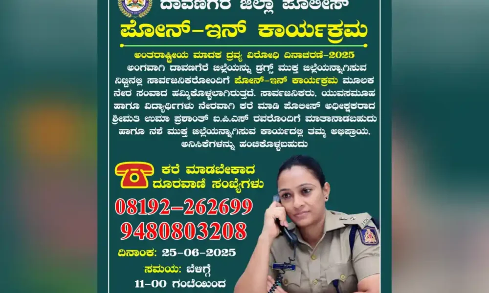 ಸುದ್ದಿದಿನ,ದಾವಣಗೆರೆ:ಪೊಲೀಸ್ ಅಧೀಕ್ಷಕರಾದ ಉಮಾ ಪ್ರಶಾಂತ್ ಅವರು ನಾಳೆ ಪೋನ್ –ಇನ್ ಕಾರ್ಯಕ್ರಮದ ಮೂಲಕ ನೇರಸಂವಾದದಲ್ಲಿ ಪಾಲ್ಗೊಳ್ಳಲಿದ್ದಾರೆ. ಅಂತರಾಷ್ಟ್ರೀಯ ಮಾದಕ ದ್ರವ್ಯ ವಿರೋಧಿ ದಿನಾಚರಣೆ ಅಂಗವಾಗಿ ದಾವಣಗೆರೆ ಜಿಲ್ಲೆಯನ್ನು ಡ್ರಗ್ಸ್ ಮುಕ್ತ- ನಶೆಮುಕ್ತ ಜಿಲ್ಲೆಯನ್ನಾಗಿಸುವ ನಿಟ್ಟಿನಲ್ಲಿ ನಾಳೆ...
